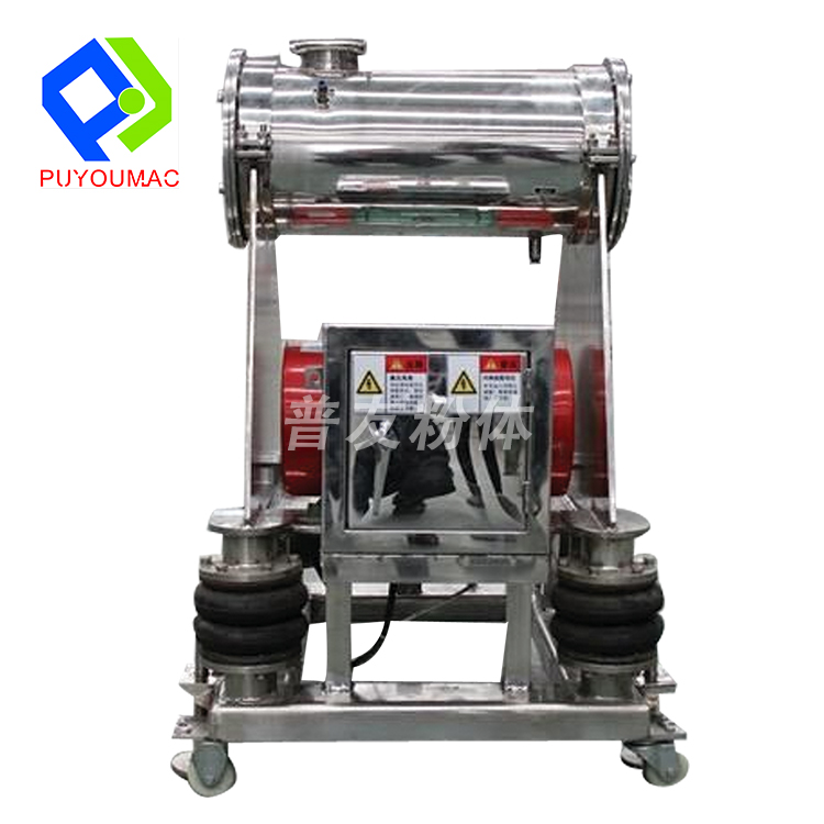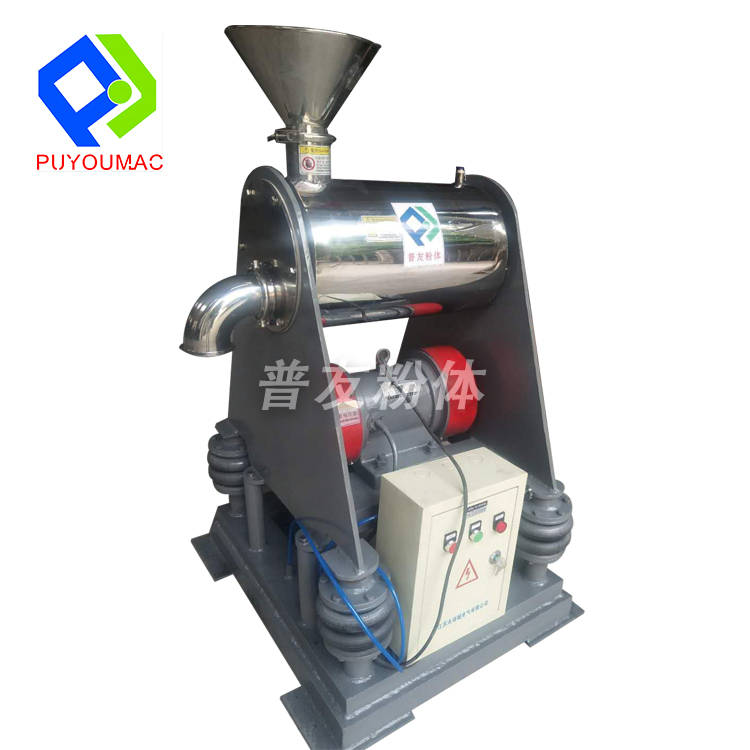 该机为卧式振动磨,物料由加料斗进入粉碎室,经振动将粉碎室内的研磨棒与物料碰撞、研磨而获得粉碎,该机配有水冷却装置,可控制粉碎室内的温度,整机按“GMP”标准设计,采用不锈钢制造,设备在全密封状态下作业,无粉尘飞扬,无环境污染。