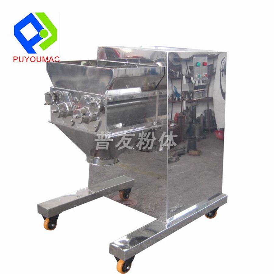 二、工作原理:通过机械传动使滚筒往复摆动,将物料从筛网中挤出制成颗粒或粉碎制粒或快速制粒。